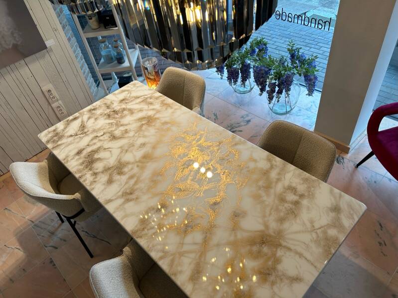 Each table is made with the best quality plywood and with multiple layers of epoxy resin then adorned with gold marble accents. The use of carefully selected materials ensures that each table is a unique artwork, with no two pieces being exaclty alike.